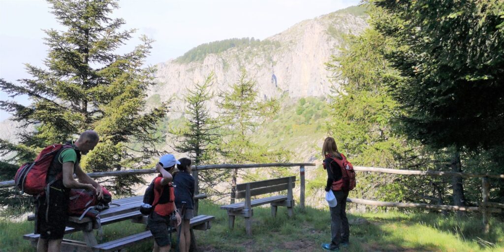 Dopo meno di 10 minuti sulla sinistra si apre una bella veduta su una bastonata rocciosa, c’è anche un tavolo con panchina dove poter fare una sosta al piccolo camminatore!