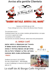 “Babbo Natale arriva dal mare” è l’iniziativa che animerà Domenica 14 Dicembre 2025 il Borgo Café, nella zona della Marina di Sestri Ponente. Una mattinata pensata per i più piccoli, con un’attenzione particolare alla dimensione familiare e al valore della tradizione natalizia.