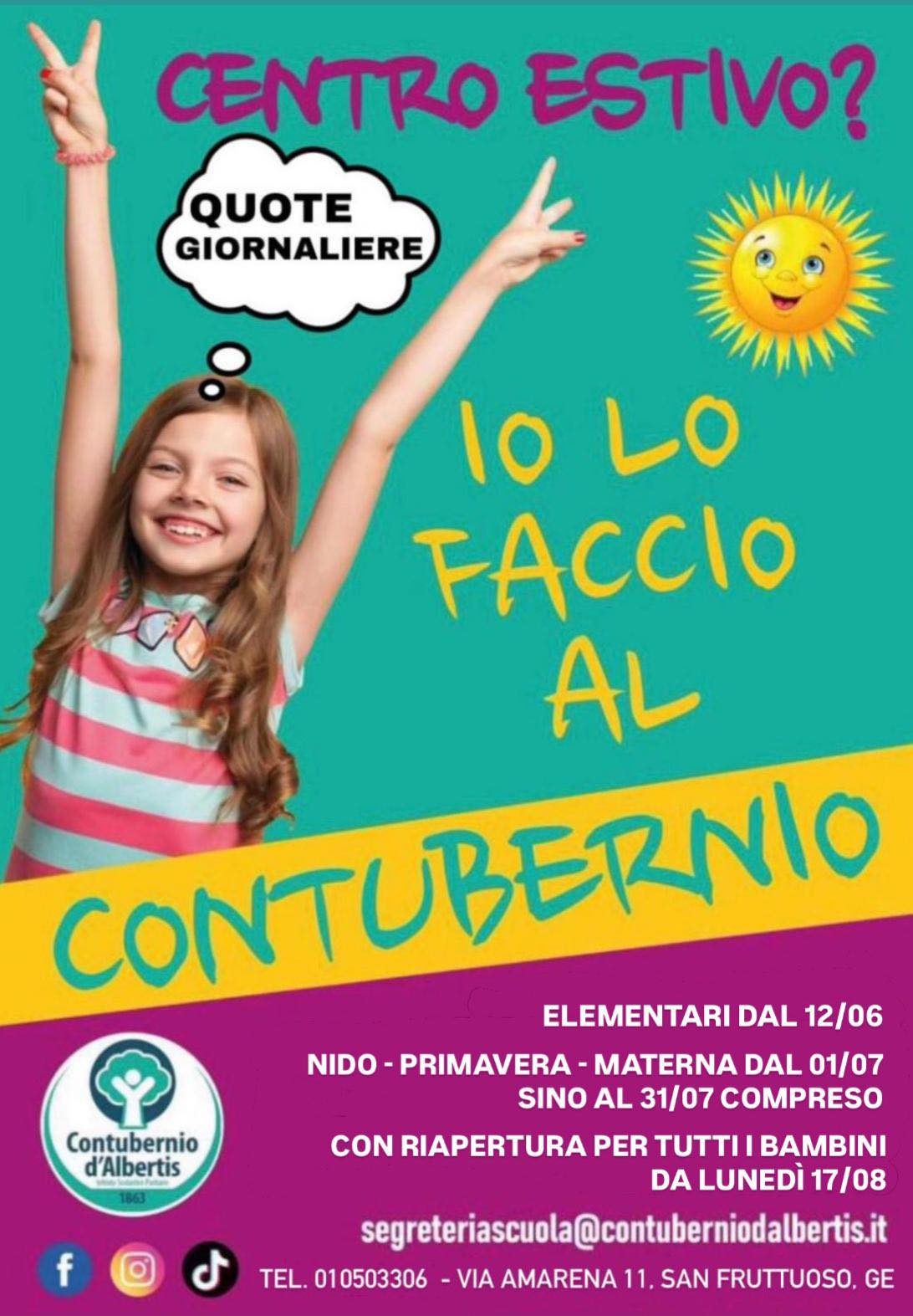 L’Istituto Scolastico Paritario “Contubernio D’Albertis” (dal 1863 al servizio dell’infanzia con Asilo Nido-Sezione Primavera-Scuole Materne-Elementari-Medie) organizza, per il ventinovesimo anno consecutivo, in Via Amarena, 11 (San Fruttuoso – sopra Piazza Solari- a 10 minuti dalla Stazione Brignole – Info & Iscrizioni 010/503306 – Indirizzo mail: segreteriascuola@contuberniodalbertis.it il Centro Estivo rivolto a tutti i bambini genovesi (interni ed esterni alla scuola) fra i 12 mesi e i 14 anni.
