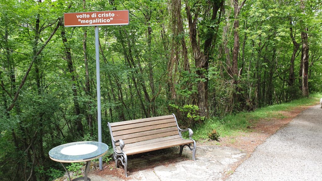 Scherzi a parte: risolverete l’enigma solo sedendovi sulla panchina perché, una volta accomodatisi, alzando lo sguardo davanti a voi vedrete apparire, sul costone sovrastante la strada, il volto di Cristo, scolpito nella roccia.