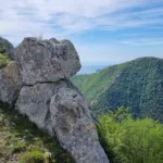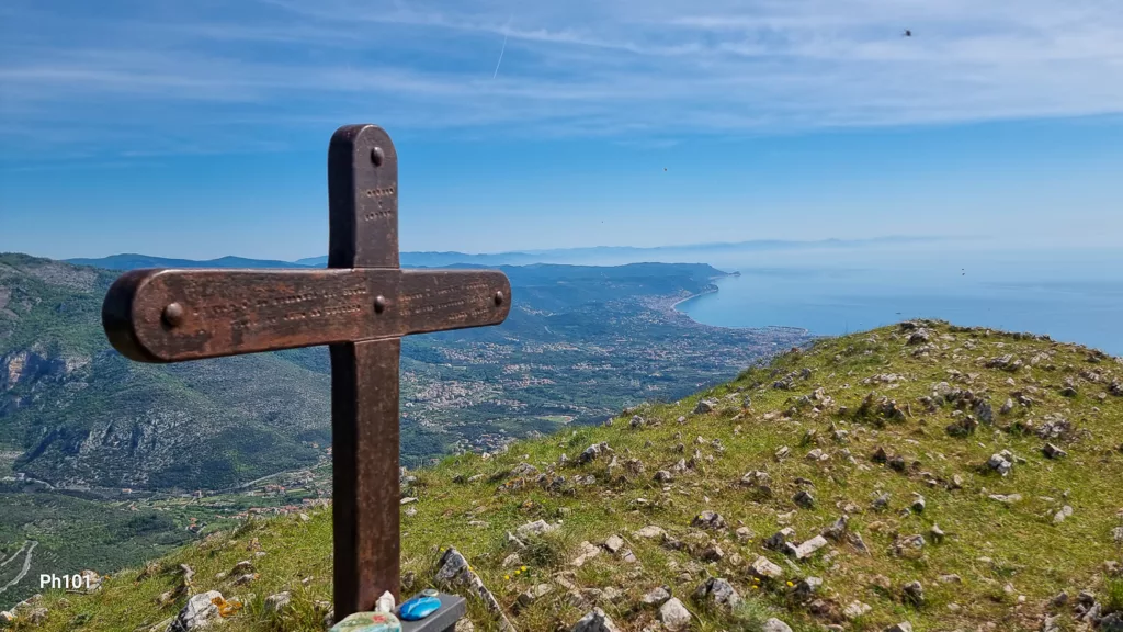 Poi, all’improvviso, la vetta: 748 metri di altitudine, una croce di pietra, e una vista che toglie il fiato. La Piana di Albenga sotto di voi, l’isola Gallinara che spunta dal mare, Loano e Borghetto che sembrano giocattoli, e se siete fortunati con il meteo, perfino l’isola Palmaria in lontananza.