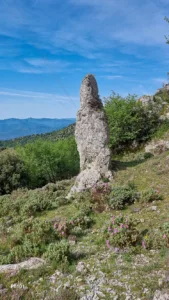 Qui il sentiero si fa più panoramico e inizia a salire dolcemente lungo una cresta che alterna tratti aperti a passaggi più protetti, sul versante orientale. In mezzo alla vegetazione iniziano a spuntare degli strani pinnacoli bianchi.
