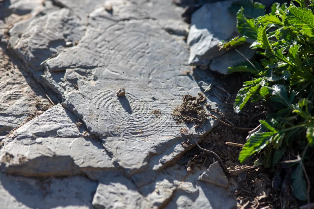 Ma non è finita qui! Se osservate bene, noterete delle pietre con scanalature a spirale, tracce fossili di un’antica felce chiamata Helmantoidea labirintica.