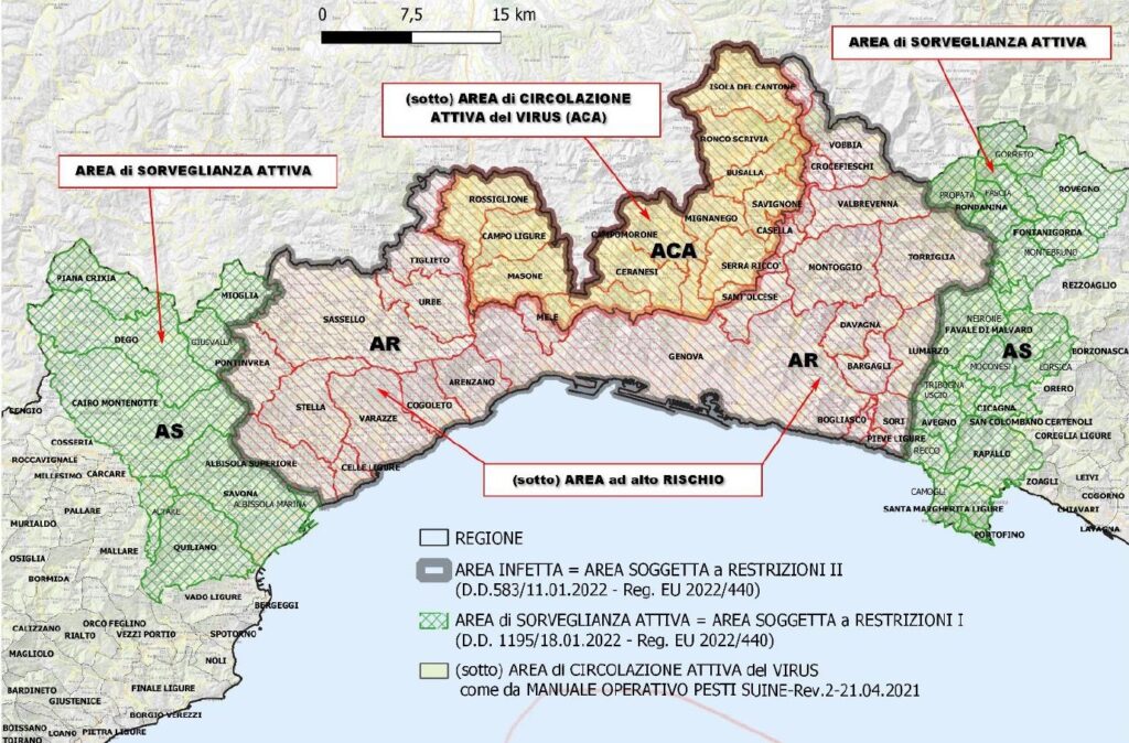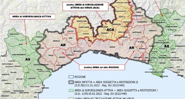 La principale novità del Piano della Regione è la suddivisione dell’area di infezione dei 114 Comuni Liguri e Piemontesi già oggetto di restrizioni in due sub-aree: L’area di circolazione attiva del virus (ACA) e l’area ad alto rischio (AR).