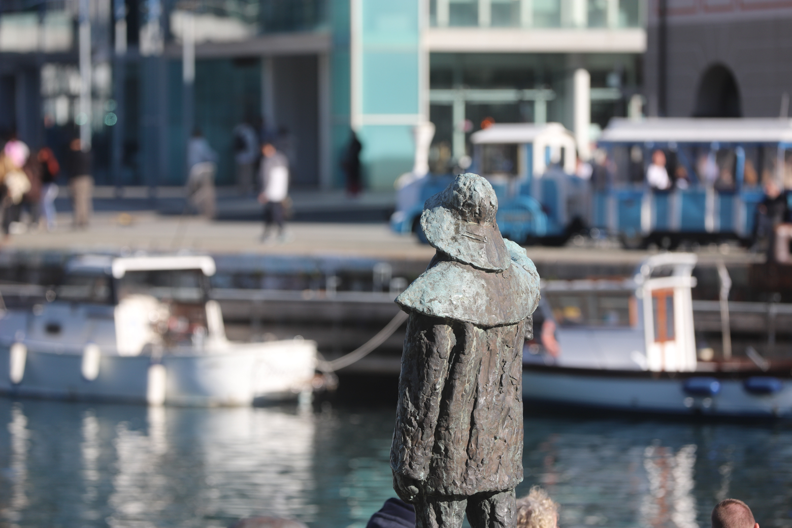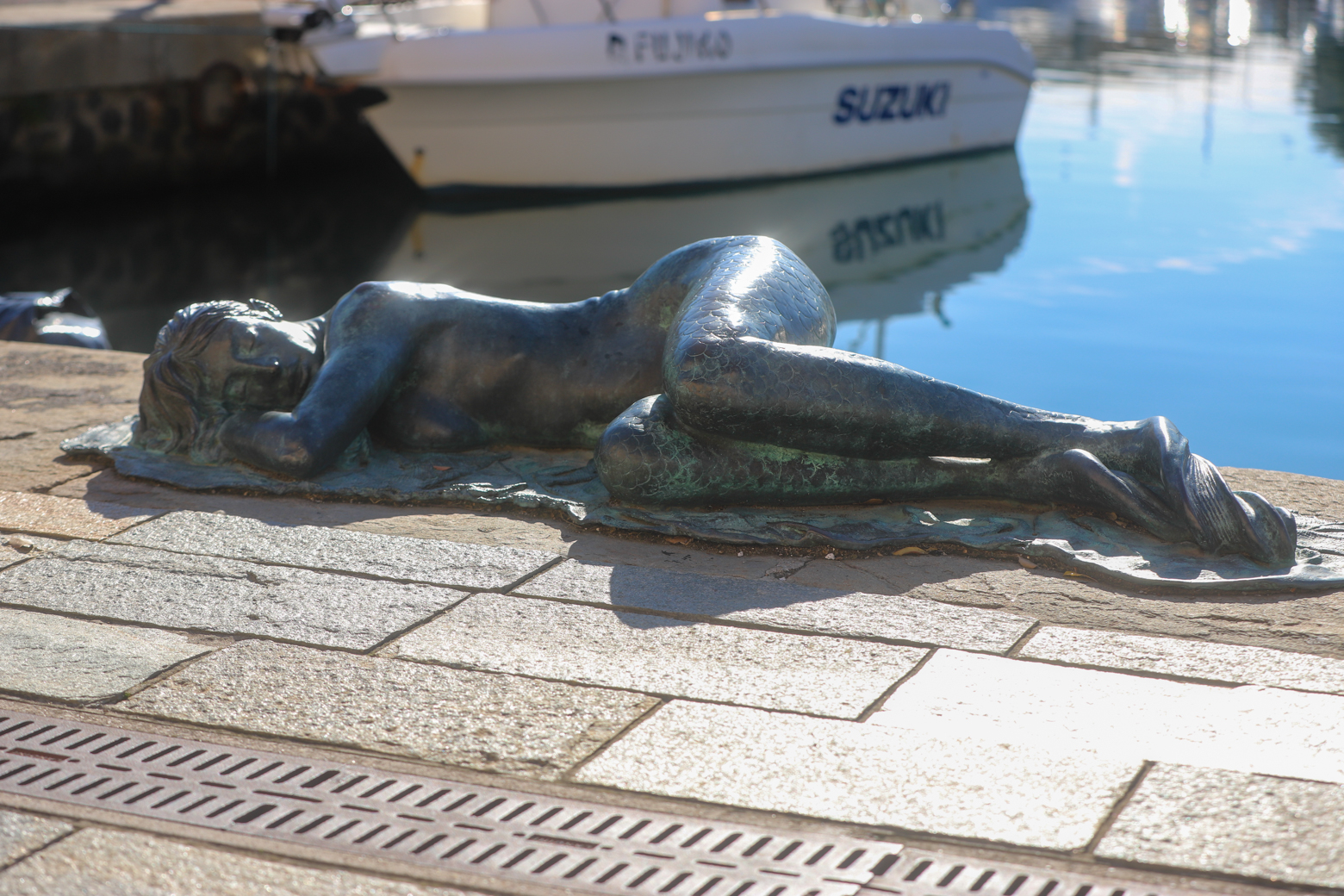 Camminando lungo la banchina si incontra una curiosità poco conosciuta: una statua di sirenetta sdraiata sul molo, quasi nascosta tra le barche.