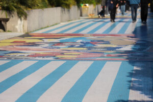 Entrando ad Albisola Marina, la passeggiata assume un carattere diverso. Il pavimento del lungomare diventa un grande mosaico colorato.
