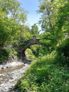 Non ci sono fontanelle, non è fattibile con passeggini essendo sterrato, in discesa e a gradoni… gradoni che “pesano” in salita, per fortuna ci sono 3 panchine utili per prendere fiato. All’inizio del percorso ci sono 2 tavoli con panche, durante il sentiero ci sono cartelli che spiegano gli alberi che si incontrano, poi a fine discesa si arriva (in circa mezz’ora) allo splendido ponticello medioevale che è accanto al rifugio (oggi era chiuso x emergenza covid); qui si trovano parecchi altri tavoli (alcuni sotto una copertura) e un punto bbq.